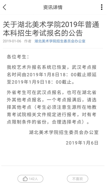1月6日,湖北美術(shù)學(xué)院發(fā)布的報名時間順延通告。