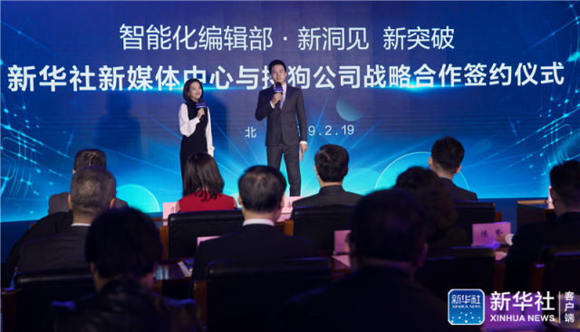 2月19日,新華社聯(lián)合搜狗公司在京發(fā)布全新升級的站立式AI合成主播并推出全球首個AI合成女主播。圖為新華社副社長劉思揚、搜狗公司CEO王小川共同啟動AI合成主播升級。新華社記者 肖磊濤 攝