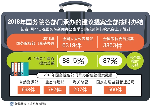新華社北京2月27日電(胡璐、張涵)2018年,國務(wù)院各部門牽頭辦理全國人大代表建議6319件,全國政協(xié)委員提案3863件,分別占“兩會(huì)”建議提案總數(shù)的88.5%和87%,已全部按時(shí)辦結(jié)。