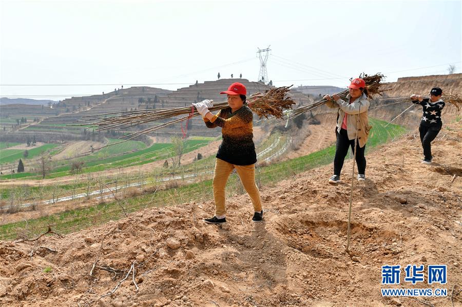 村民在扶貧大棚內(nèi)搬運培育的西紅柿幼苗