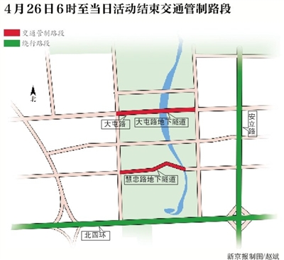 4月23日0時(shí)至4月26日活動(dòng)結(jié)束,由北辰西路與大屯路交叉口(不含)經(jīng)大屯路、天辰西路、大屯北路(不含)、湖景東路、國(guó)家體育場(chǎng)北路、景觀大道、慧忠路、天辰西路至大屯路以內(nèi)區(qū)域道路,除持有“高峰論壇”專用證件的車(chē)輛外,禁止其他車(chē)輛通行。