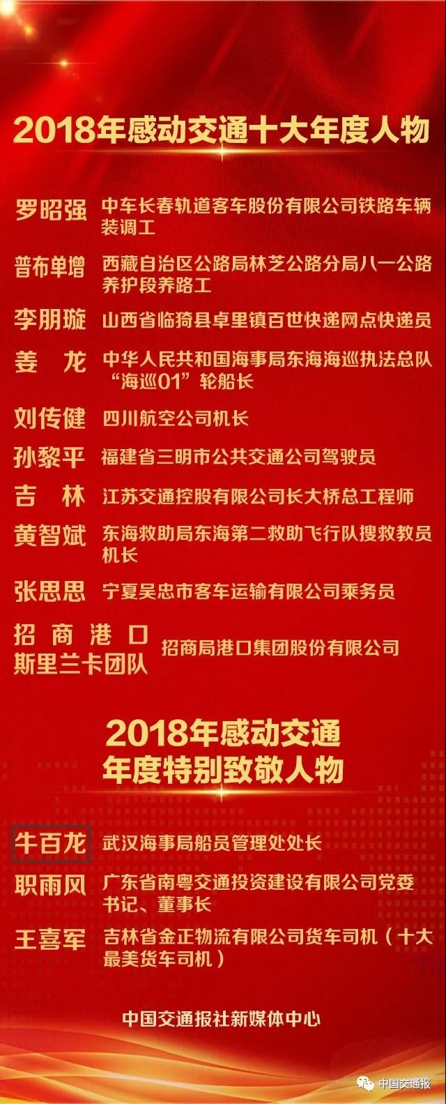 另外,將青春和生命奉獻(xiàn)給海事交通事業(yè)的武漢海事局船員管理處處長(zhǎng)牛百龍;胸懷大愛(ài),積極踐行“大道為公”理念的廣東南粵交通投資建設(shè)有限公司黨委書(shū)記、董事長(zhǎng)職雨風(fēng);400萬(wàn)公里安全駕駛、細(xì)心工作、熱心助人的吉林省物流貨車(chē)司機(jī)王喜軍榮獲“2018年感動(dòng)交通年度特別致敬人物”稱號(hào)。