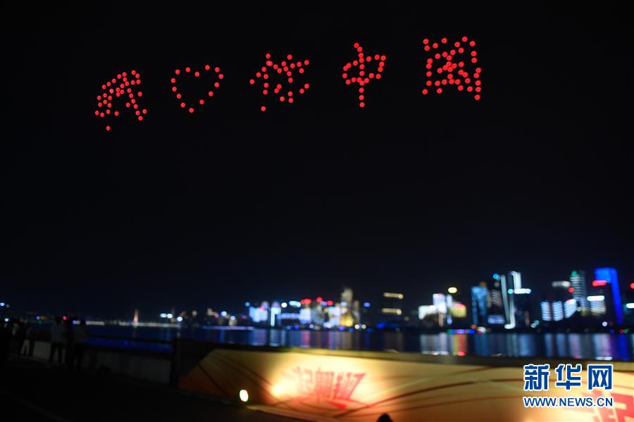 5月20日,約150架無人機(jī)空中編隊(duì)在錢塘江上空組成“我愛你中國”字樣。 當(dāng)晚,在浙江杭州錢塘江畔,城市燈光秀和約150架無人機(jī)組成的空中編隊(duì)表演交相輝映?!?20中國”“我愛你中國”“70年”……對祖國進(jìn)行的一場“深情告白”閃耀錢塘兩岸。 新華社記者黃宗治攝