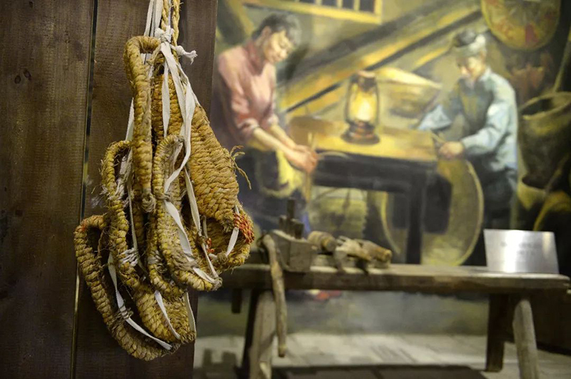在于都縣中央紅軍長征出發(fā)紀念館內(nèi)展示的草鞋和制作草鞋的工具。新華社記者 萬象 攝