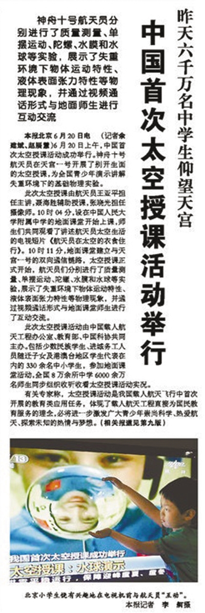 2013年6月21日人民日報頭版報道太空授課。資料圖片