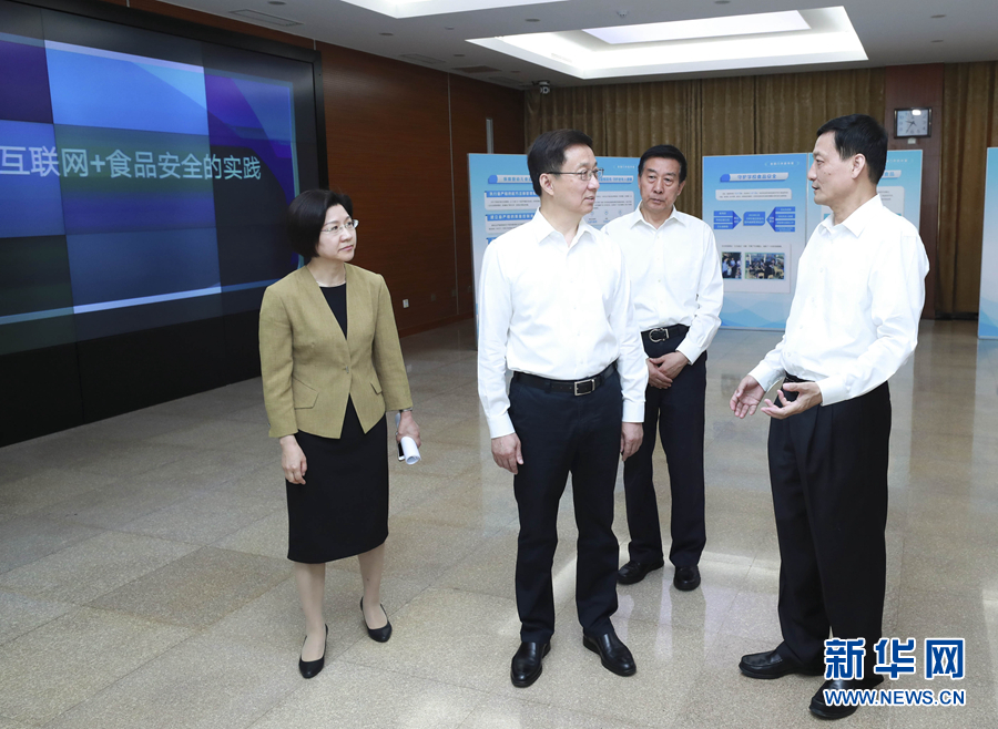 6月13日,在2019年全國(guó)食品安全宣傳周活動(dòng)前夕,中共中央政治局常委、國(guó)務(wù)院副總理、國(guó)務(wù)院食品安全委員會(huì)主任韓正到國(guó)務(wù)院食品安全委員會(huì)辦公室主持召開座談會(huì),聽取對(duì)食品安全工作的意見建議。這是會(huì)前,韓正參觀食品安全工作情況展示,考察了解食品安全智慧監(jiān)管的創(chuàng)新舉措。 新華社記者 龐興雷 攝