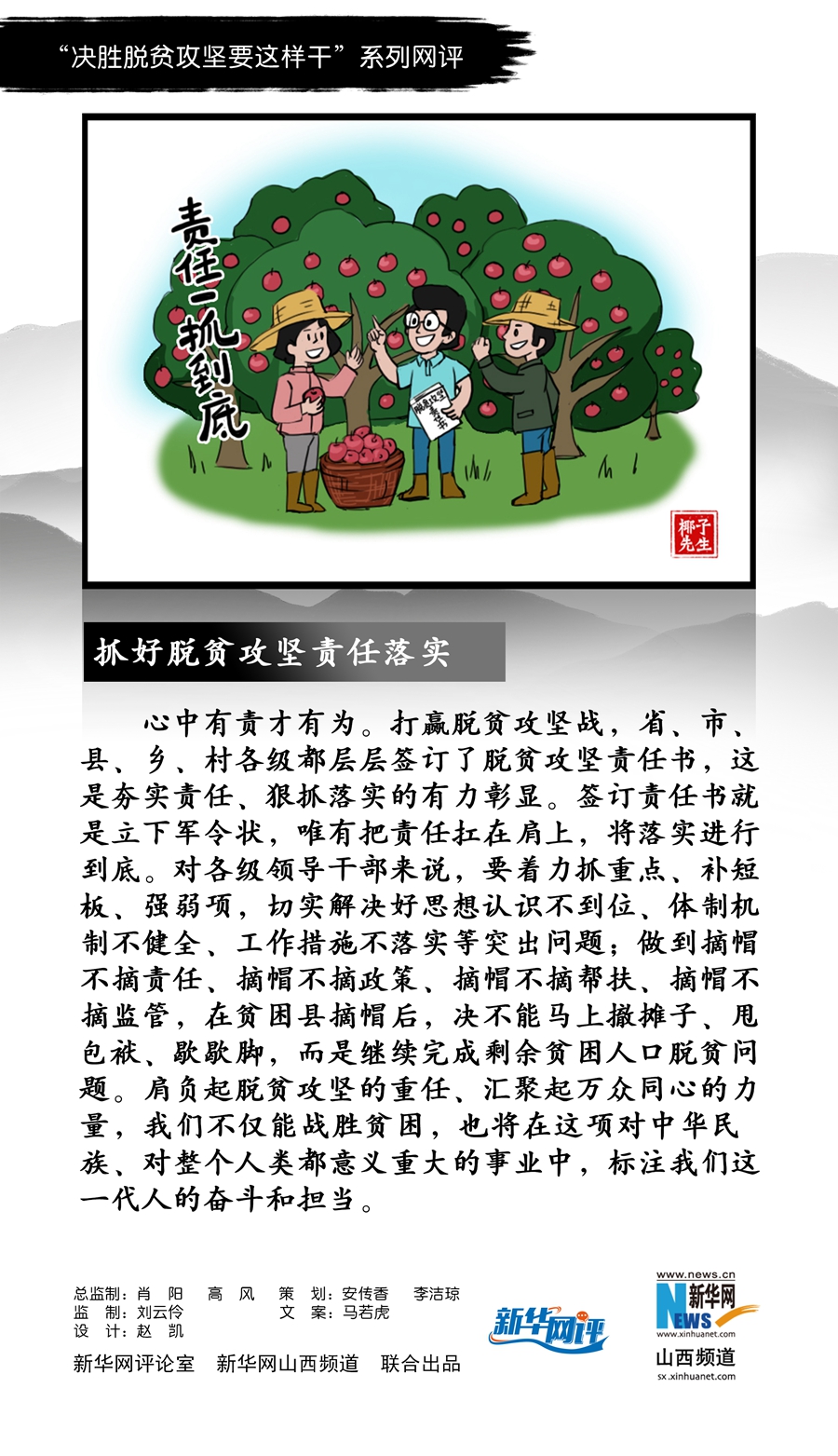 心中有責(zé)才有為。打贏脫貧攻堅(jiān)戰(zhàn),省、市、縣、鄉(xiāng)、村各級(jí)都層層簽訂了脫貧攻堅(jiān)責(zé)任書(shū),這是夯實(shí)責(zé)任、狠抓落實(shí)的有力彰顯。簽訂責(zé)任書(shū)就是立下軍令狀,唯有把責(zé)任扛在肩上,將落實(shí)進(jìn)行到底。對(duì)各級(jí)領(lǐng)導(dǎo)干部來(lái)說(shuō),要著力抓重點(diǎn)、補(bǔ)短板、強(qiáng)弱項(xiàng),切實(shí)解決好思想認(rèn)識(shí)不到位、體制機(jī)制不健全、工作措施不落實(shí)等突出問(wèn)題;做到摘帽不摘責(zé)任、摘帽不摘政策、摘帽不摘幫扶、摘帽不摘監(jiān)管,在貧困縣摘帽后,決不能馬上撤攤子、甩包袱、歇歇腳,而是繼續(xù)完成剩余貧困人口脫貧問(wèn)題。肩負(fù)起脫貧攻堅(jiān)的重任、匯聚起萬(wàn)眾同心的力量,我們不僅能戰(zhàn)勝貧困,也將在這項(xiàng)對(duì)中華民族、對(duì)整個(gè)人類都意義重大的事業(yè)中,標(biāo)注我們這一代人的奮斗和擔(dān)當(dāng)。(馬若虎)