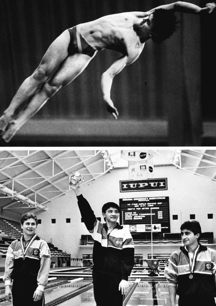1989年5月7日,中國(guó)選手熊倪奪得第六屆世界杯跳水賽男子十米跳臺(tái)跳水冠軍。上圖是他在比賽中,下圖是他在領(lǐng)獎(jiǎng)臺(tái)上。新華社記者 韓居策 攝