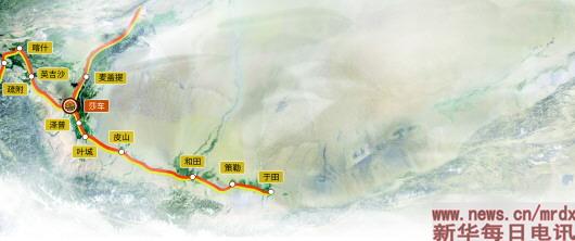 打開(kāi)地圖,沿著古絲綢之路一路向西,在敦煌分了一個(gè)岔,一路向北的叫北線,一路向南的叫南線,中間隔著塔克拉瑪干大沙漠。南線沿著沙漠邊緣,在昆侖山脈水系的滋潤(rùn)下,出現(xiàn)一串珍珠似的綠洲:樓蘭、于田、莎車(chē)……