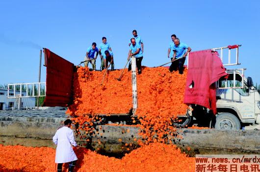 2019年7月,工人們將整車(chē)的萬(wàn)壽菊卸下來(lái),放進(jìn)晨光生物莎車(chē)公司的青儲(chǔ)池進(jìn)行發(fā)酵,再進(jìn)行烘干、造粒、萃取后得到葉黃素浸膏,加工成葉黃素晶體,遠(yuǎn)銷(xiāo)海外。