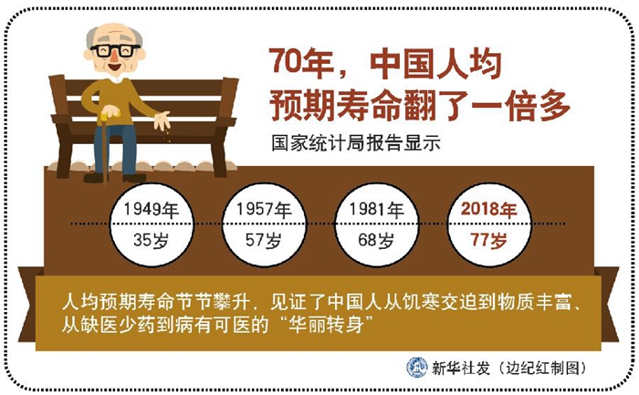 國家統(tǒng)計局報告顯示,1949年35歲,1957年57歲,1981年68歲,2018年77歲——人均預期壽命節(jié)節(jié)攀升,見證了中國人從饑寒交迫到物質豐富、從缺醫(yī)少藥到病有可醫(yī)的“華麗轉身”——
