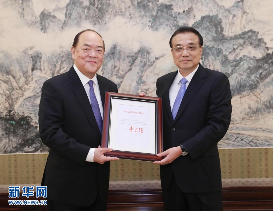 新華社北京9月11日電(記者劉歡)國務院總理李克強9月11日上午在中南海紫光閣會見賀一誠,頒發(fā)任命他為中華人民共和國澳門特別行政區(qū)第五任行政長官的國務院第719號令。