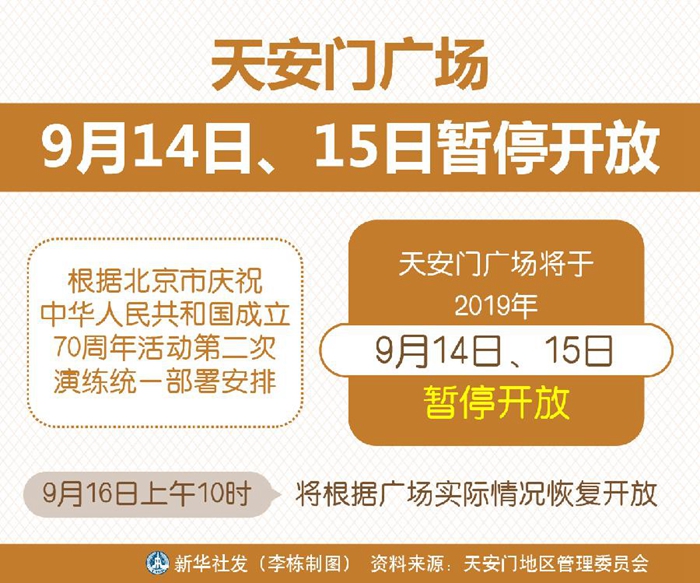 新華社北京9月11日電(記者魯暢)記者從天安門地區(qū)管理委員會(huì)獲悉,根據(jù)北京市慶祝中華人民共和國成立70周年活動(dòng)第二次演練統(tǒng)一部署安排,天安門廣場將于2019年9月14日、15日暫停開放。9月16日上午10時(shí),將根據(jù)廣場實(shí)際情況恢復(fù)開放。