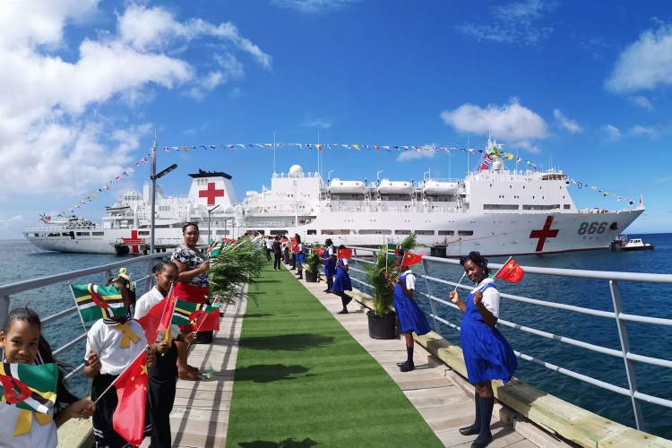2018年10月12日,在多米尼克首都羅索,當(dāng)?shù)貙W(xué)生揮動(dòng)多中兩國(guó)國(guó)旗歡迎中國(guó)海軍和平方舟醫(yī)院船首次到訪。(新華社發(fā))