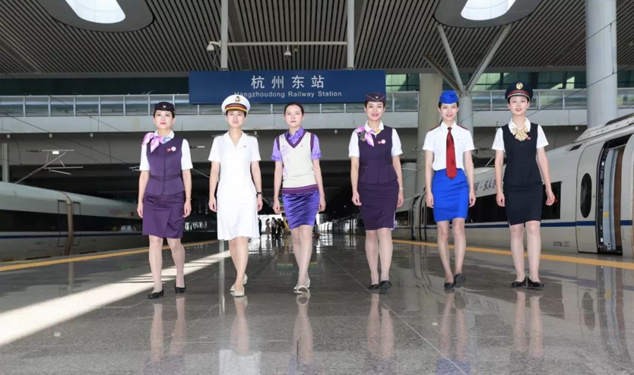 10月2日,浙江杭州。杭州客運(yùn)段列車員穿上不同的鐵路制服。作者:沈克勤