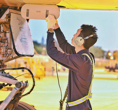 10日,機(jī)務(wù)人員進(jìn)行起飛前的各項(xiàng)檢查。當(dāng)日,??诿捞m機(jī)場(chǎng)飛往北京大興機(jī)場(chǎng)的首個(gè)航班順利起航。朱榮鵬 紀(jì)巧珠攝影報(bào)道(影像中國(guó))