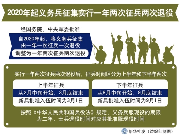 新華社北京1月16日電(記者賈啟龍)經(jīng)國務(wù)院、中央軍委批準(zhǔn),自2020年起,將義務(wù)兵征集由一年一次征兵一次退役,調(diào)整為一年兩次征兵兩次退役。