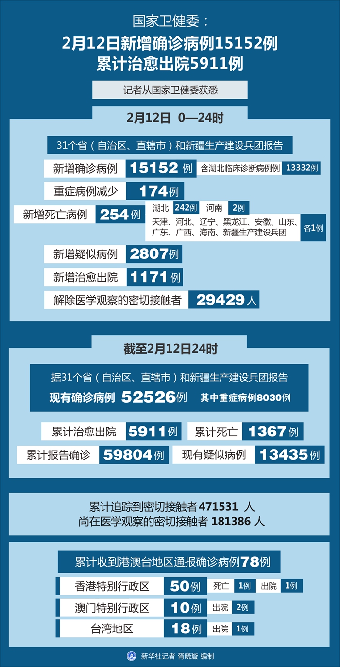 截至2月12日24時,據(jù)31個?。ㄗ灾螀^(qū)、直轄市)和新疆生產(chǎn)建設(shè)兵團(tuán)報告,現(xiàn)有確診病例52526例(其中重癥病例8030例),累計治愈出院病例5911例,累計死亡病例1367例,累計報告確診病例59804例,現(xiàn)有疑似病例13435例。累計追蹤到密切接觸者471531人,尚在醫(yī)學(xué)觀察的密切接觸者181386人。