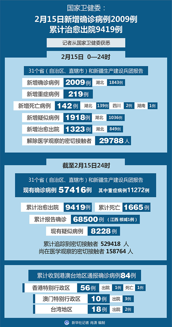 截至2月15日24時,據(jù)31個省(自治區(qū)、直轄市)和新疆生產(chǎn)建設(shè)兵團(tuán)報告,現(xiàn)有確診病例57416例(其中重癥病例11272例),累計(jì)治愈出院病例9419例,累計(jì)死亡病例1665例,累計(jì)報告確診病例68500例(江西省核減1例),現(xiàn)有疑似病例8228例。累計(jì)追蹤到密切接觸者529418人,尚在醫(yī)學(xué)觀察的密切接觸者158764人。