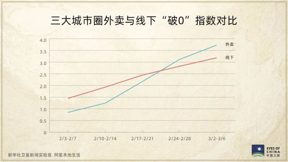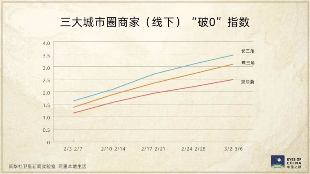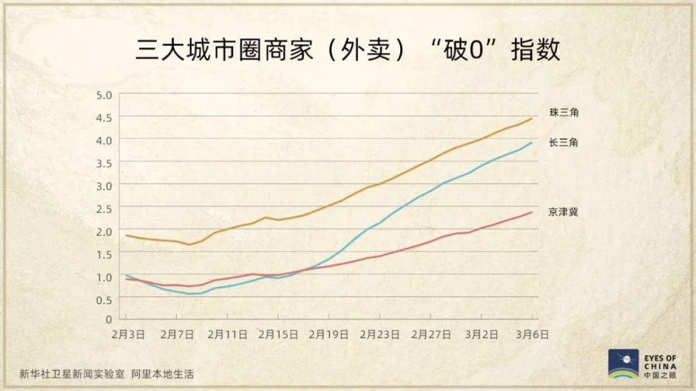 “破0”指數(shù),是根據(jù)商家恢復(fù)營業(yè)獲得首筆收入、復(fù)工后的持續(xù)營業(yè)時(shí)間等計(jì)算得出,這兩張圖呈現(xiàn)出,在三大城市圈,復(fù)工復(fù)產(chǎn)并獲得收入的商家不斷增多。