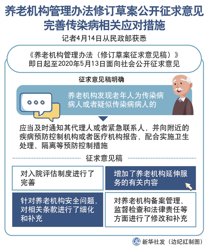 新華社北京4月14日電(記者孫少龍)記者14日從民政部獲悉,《養(yǎng)老機(jī)構(gòu)管理辦法(修訂草案征求意見(jiàn)稿)》即日起至2020年5月13日面向社會(huì)公開(kāi)征求意見(jiàn),結(jié)合新冠肺炎疫情防控要求,征求意見(jiàn)稿依法完善了養(yǎng)老機(jī)構(gòu)發(fā)現(xiàn)老年人為傳染病病人或者疑似傳染病病人時(shí)的應(yīng)對(duì)措施。