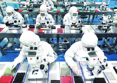 江蘇連云港海州經(jīng)濟(jì)開發(fā)區(qū)內(nèi)一公司,工人正在加緊生產(chǎn)一批海外企業(yè)配套的手機(jī)攝像頭產(chǎn)品。耿玉和攝/光明圖片