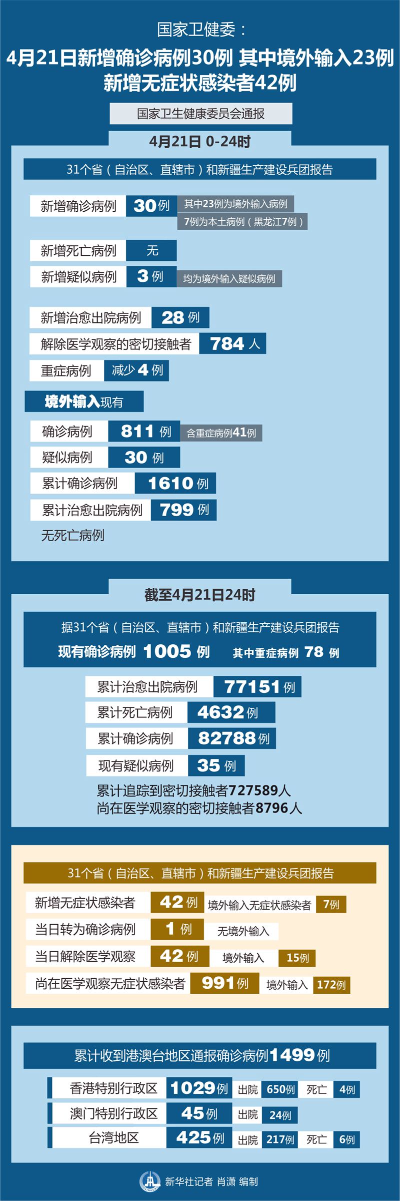 截至4月21日24時(shí),據(jù)31個(gè)?。ㄗ灾螀^(qū)、直轄市)和新疆生產(chǎn)建設(shè)兵團(tuán)報(bào)告,現(xiàn)有確診病例1005例(其中重癥病例78例),累計(jì)治愈出院病例77151例,累計(jì)死亡病例4632例,累計(jì)報(bào)告確診病例82788例,現(xiàn)有疑似病例35例。累計(jì)追蹤到密切接觸者727589人,尚在醫(yī)學(xué)觀察的密切接觸者8796人。