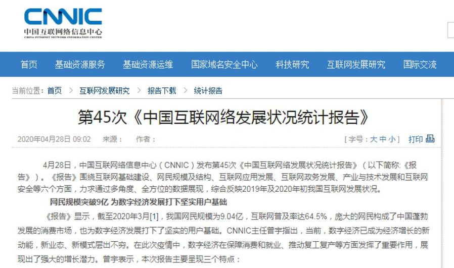 4月28日,中國互聯網絡信息中心(CNNIC)發(fā)布第45次《中國互聯網絡發(fā)展狀況統(tǒng)計報告》(以下簡稱:《報告》)?!秷蟾妗穱@互聯網基礎建設、網民規(guī)模及結構、互聯網應用發(fā)展、互聯網政務發(fā)展、產業(yè)與技術發(fā)展和互聯網安全等六個方面,力求通過多角度、全方位的數據展現,綜合反映2019年及2020年初我國互聯網發(fā)展狀況。