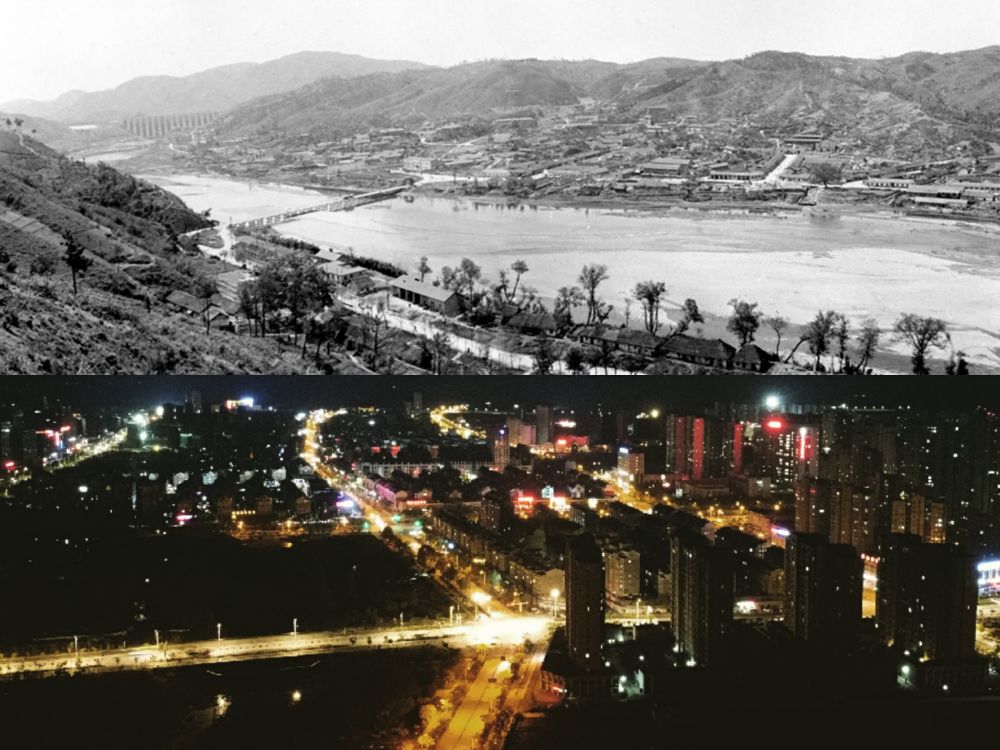 (上圖:1961年金寨縣城,新華社記者吳乙明、張幼良攝;下圖:2020年金寨縣城夜景。新華社記者陳諾攝)