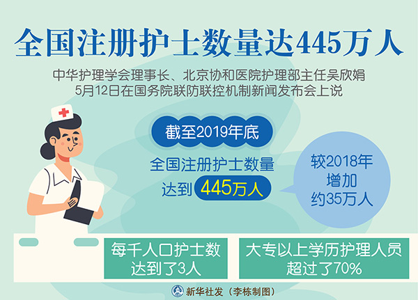 新華社北京5月12日電(記者王優(yōu)玲、王秉陽)中華護(hù)理學(xué)會理事長、北京協(xié)和醫(yī)院護(hù)理部主任吳欣娟12日在國務(wù)院聯(lián)防聯(lián)控機(jī)制新聞發(fā)布會上說,截至2019年底,全國注冊護(hù)士數(shù)量達(dá)到445萬人,較2018年增加約35萬人。每千人口護(hù)士數(shù)達(dá)到了3人,大專以上學(xué)歷護(hù)理人員超過了70%。