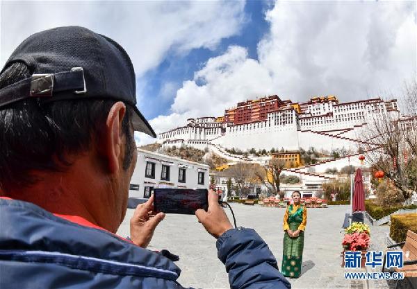 3月1日,布達(dá)拉宮管理處講解員次仁卓嘎(右)在進(jìn)行直播。 新華社記者 春拉 攝