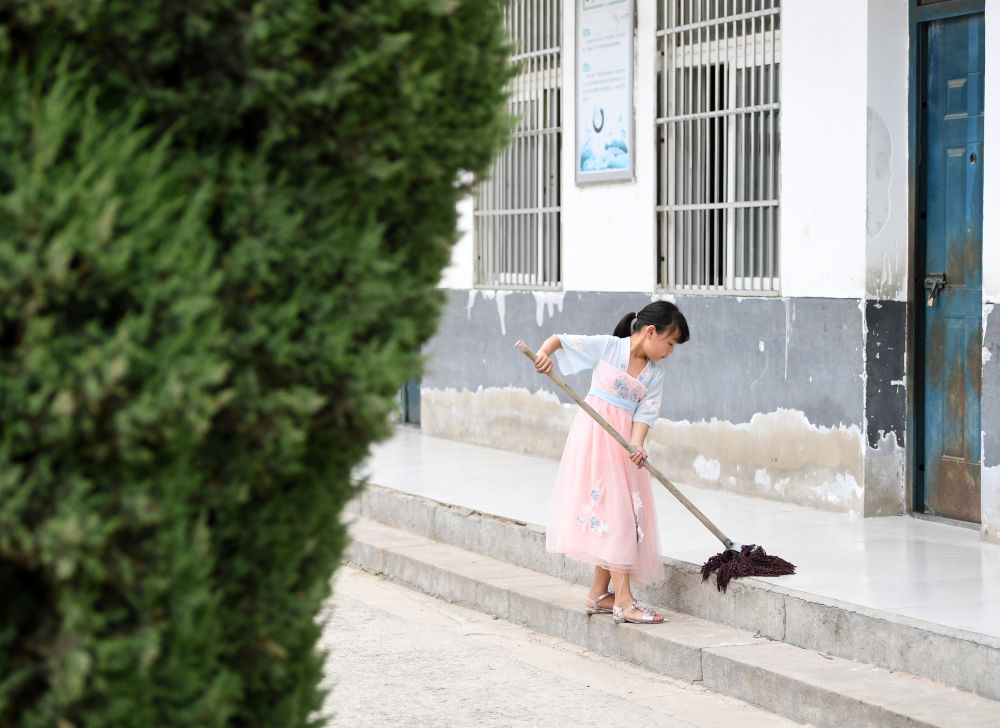 ↑?小思揚(yáng)放學(xué)后在校園里打掃衛(wèi)生。