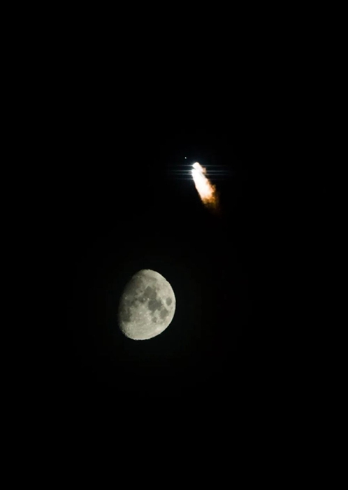 2015年3月30日,搭載首顆新一代北斗導(dǎo)航衛(wèi)星的長征三號丙運(yùn)載火箭在西昌衛(wèi)星發(fā)射中心點(diǎn)火發(fā)射,火箭升空后與明月交相輝映。新華社記者 白禹 攝