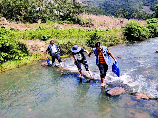 納雍縣鍋圈巖鄉(xiāng)土補村扶貧特崗張龍(右)與張迪(中)等蹚水過河走訪貧困戶。組圖均由受訪者提供(手機拍攝)