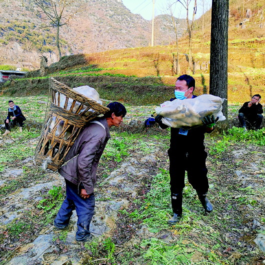 納雍縣羊場鄉(xiāng)菜子地村扶貧特崗陳熙(右)幫貧困戶采收蘿卜。