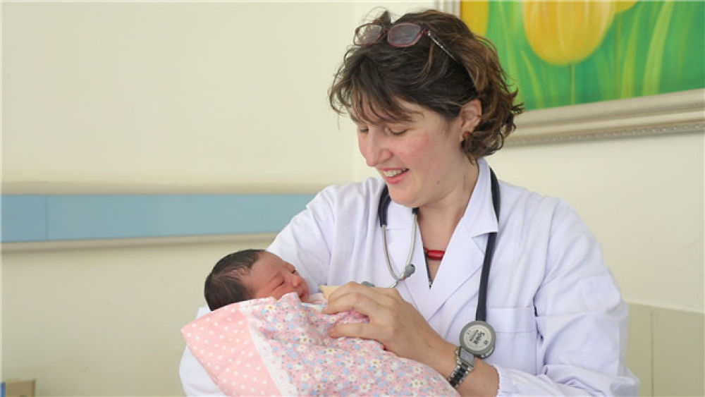 鞠瑞欣在青海紅十字醫(yī)院病房內(nèi)為一名新生兒做檢查(2019年10月18日攝)。新華社記者 趙玉和 攝