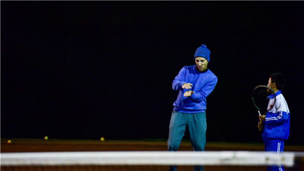 在青海省海東市互助土族自治縣的網(wǎng)球場內(nèi),喬西·羅賓遜(左)在指導(dǎo)學(xué)員發(fā)球(2019年11月7日攝)。新華社記者 吳剛 攝