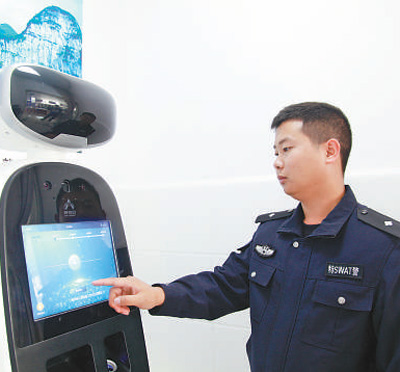 織金縣珠藏鎮(zhèn)警務(wù)助理肖發(fā)陽(yáng)在展示智能機(jī)器人如何使用。黃 嫻攝