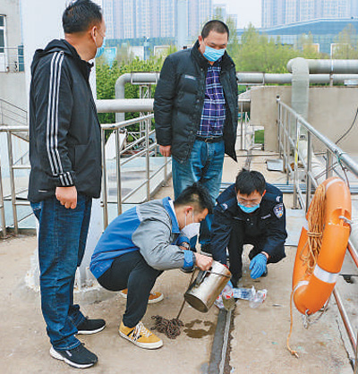 濟(jì)南的禁毒民警、禁毒社工在現(xiàn)場(chǎng)采集污水樣品。賈衛(wèi)國(guó)攝