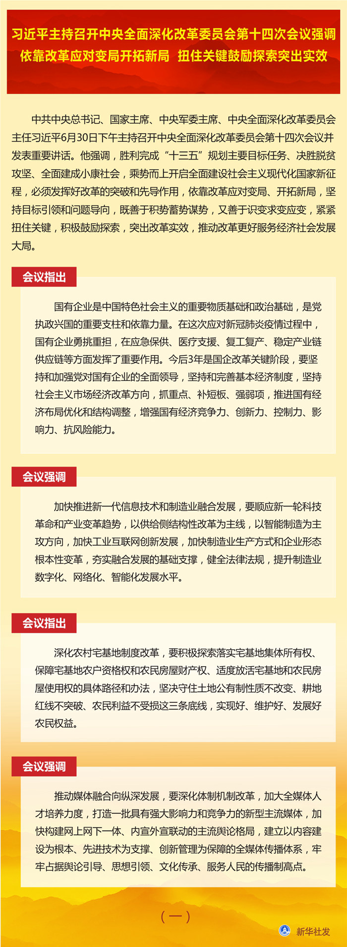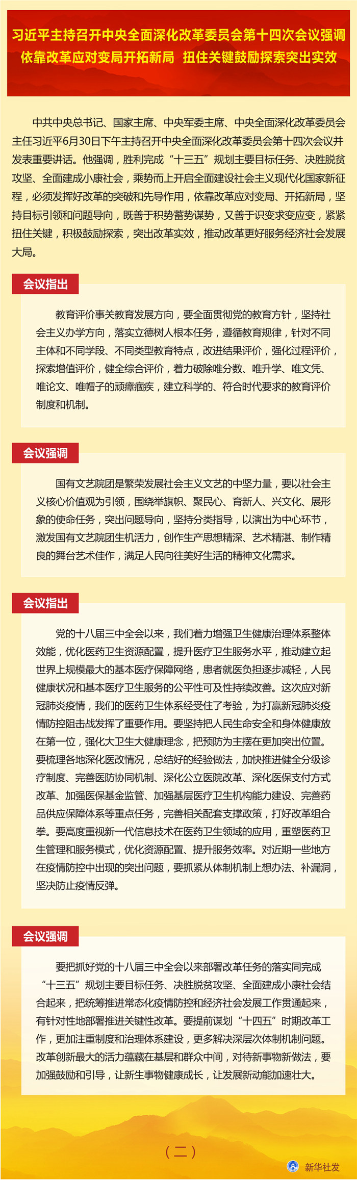 會議審議通過了《國企改革三年行動方案(2020-2022年)》、《關(guān)于深化新一代信息技術(shù)與制造業(yè)融合發(fā)展的指導(dǎo)意見》、《深化農(nóng)村宅基地制度改革試點方案》、《關(guān)于加快推進(jìn)媒體深度融合發(fā)展的指導(dǎo)意見》、《深化新時代教育評價改革總體方案》、《關(guān)于深化國有文藝院團(tuán)改革的實施意見》。會議還聽取了黨的十八屆三中全會以來醫(yī)藥衛(wèi)生體制改革進(jìn)展情況匯報。