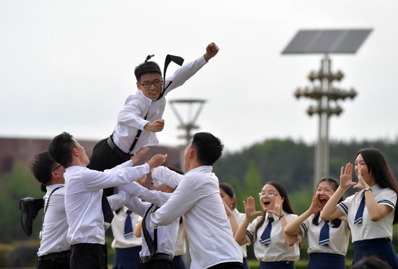 在南昌大學校園內,學子們一起歡呼,拍畢業(yè)照留念(6月10日攝)。新華社記者彭昭之攝