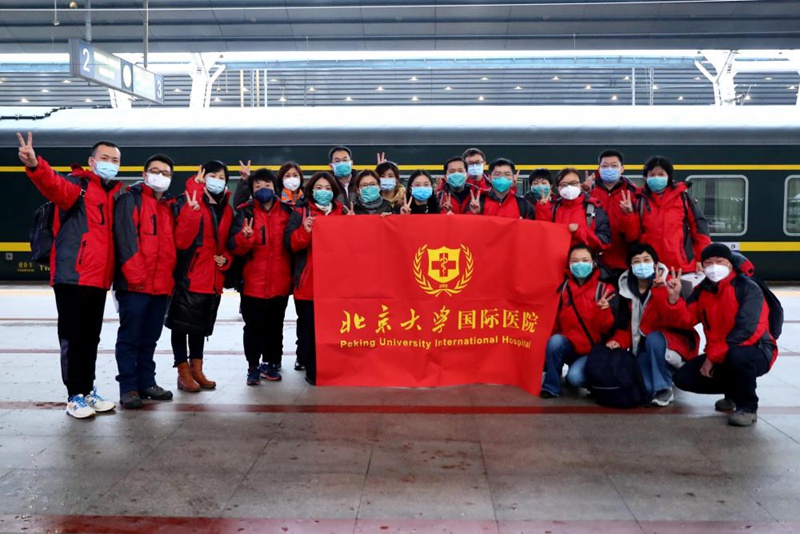 北京大學國際醫(yī)院醫(yī)療隊隊員在北京西站合影,準備乘坐火車馳援湖北抗疫(2月6日攝)。新華社記者張玉薇攝