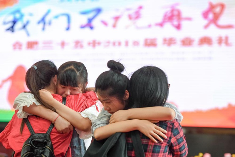 6月9日,合肥市第三十五中學的高三畢業(yè)生在畢業(yè)典禮上與老師擁抱。新華社記者張端攝