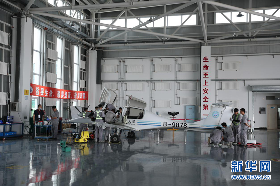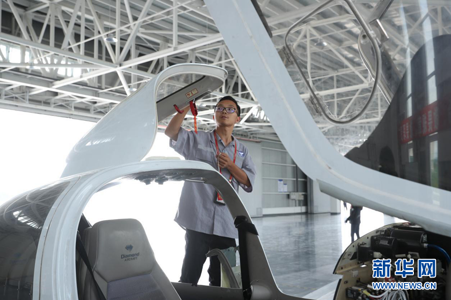 圖為中國民航大學(xué)內(nèi)蒙古飛行學(xué)院機(jī)庫中待飛的單發(fā)DA40D飛機(jī)。新華網(wǎng)記者焦鵬 攝