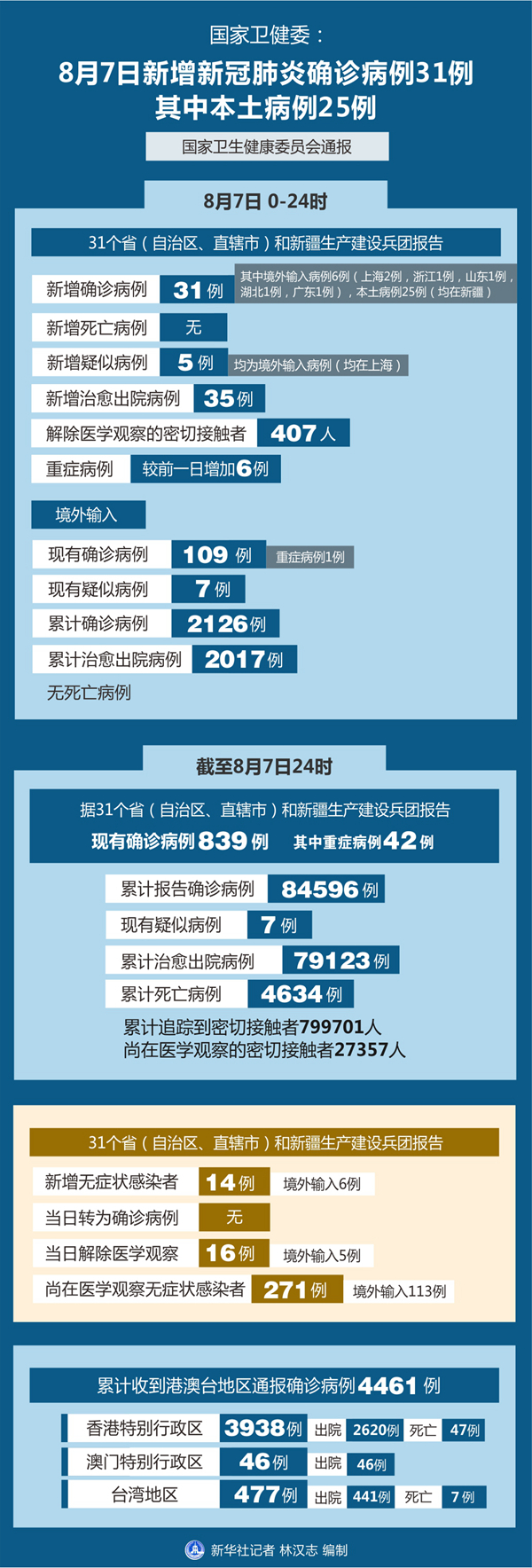 截至8月7日24時,據(jù)31個?。ㄗ灾螀^(qū)、直轄市)和新疆生產(chǎn)建設兵團報告,現(xiàn)有確診病例839例(其中重癥病例42例),累計治愈出院病例79123例,累計死亡病例4634例,累計報告確診病例84596例,現(xiàn)有疑似病例7例。累計追蹤到密切接觸者799701人,尚在醫(yī)學觀察的密切接觸者27357人。