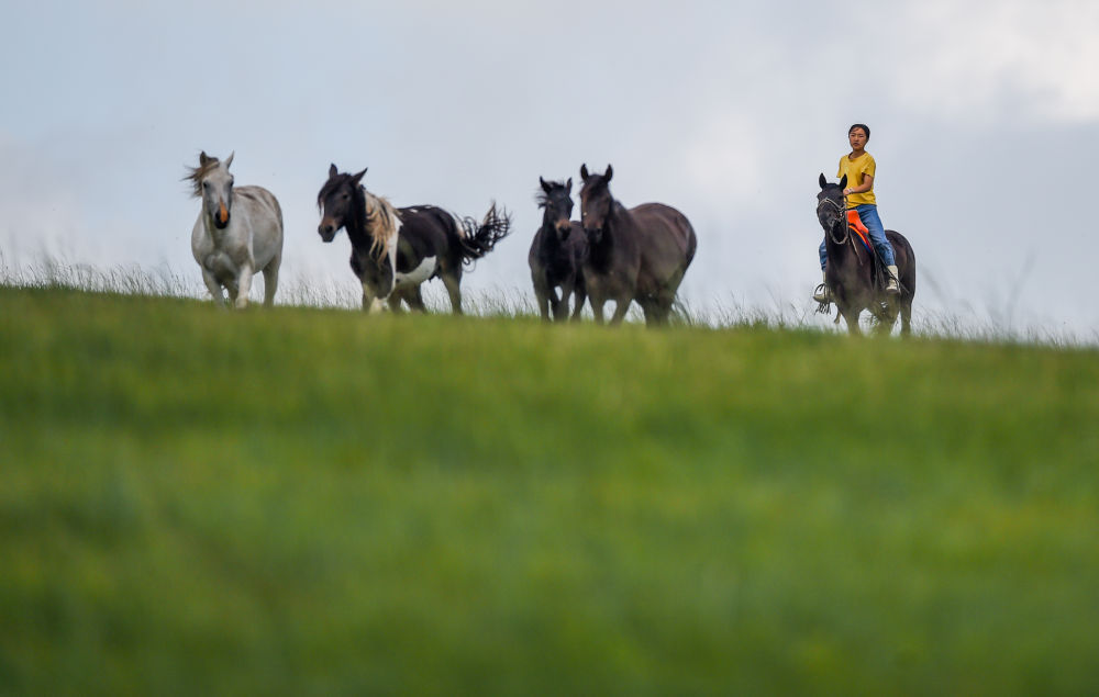 8月4日,錫林花在自家的牧場上驅(qū)趕馬群。