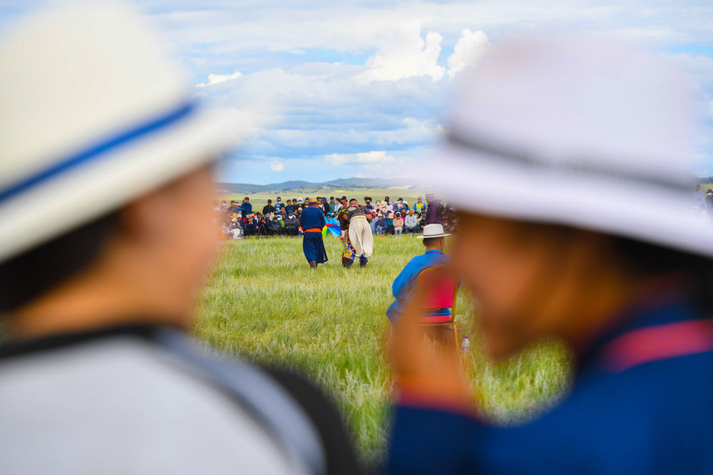 8月3日,錫林花(右)與小伙伴觀看那達慕中的搏克比賽。