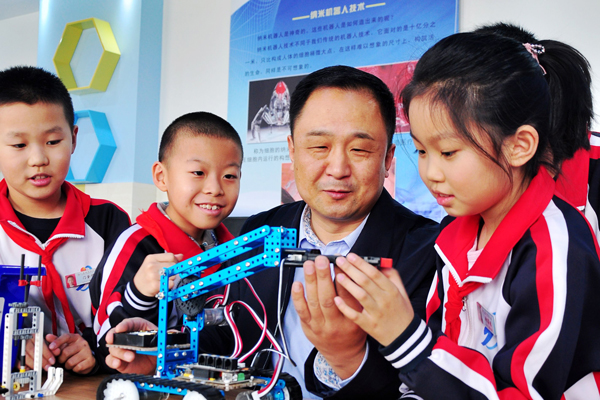 楊國營與學(xué)生在機器人課上