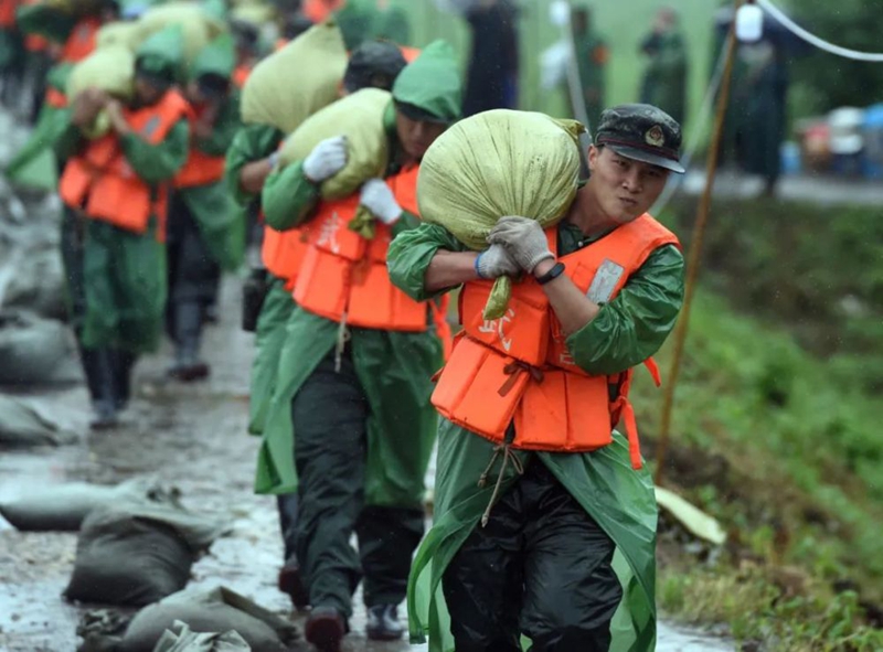 和平年代,面對波濤洶涌的洪水,解放軍官兵、民兵、消防救援人員緊急搶險(xiǎn)救災(zāi)。老百姓則紛紛走出家門,給搶險(xiǎn)救災(zāi)人員送去食物,送去溫暖: