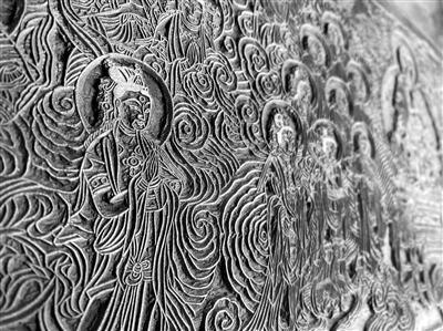 隨著白富鋼的五指輕盈地在古老的木板上游走,一塊木質(zhì)經(jīng)板上縱橫的紋理逐漸明晰起來(lái)。這批經(jīng)板始刻于清雍正十一年(公元1733年),完成于清乾隆三年(公元1738年),是我國(guó)漢文大藏經(jīng)卷帙中收錄最豐富,也是最后一部官方雕印本。經(jīng)板共計(jì)79036塊,總重達(dá)400噸。堪稱我國(guó)木板經(jīng)書之最。